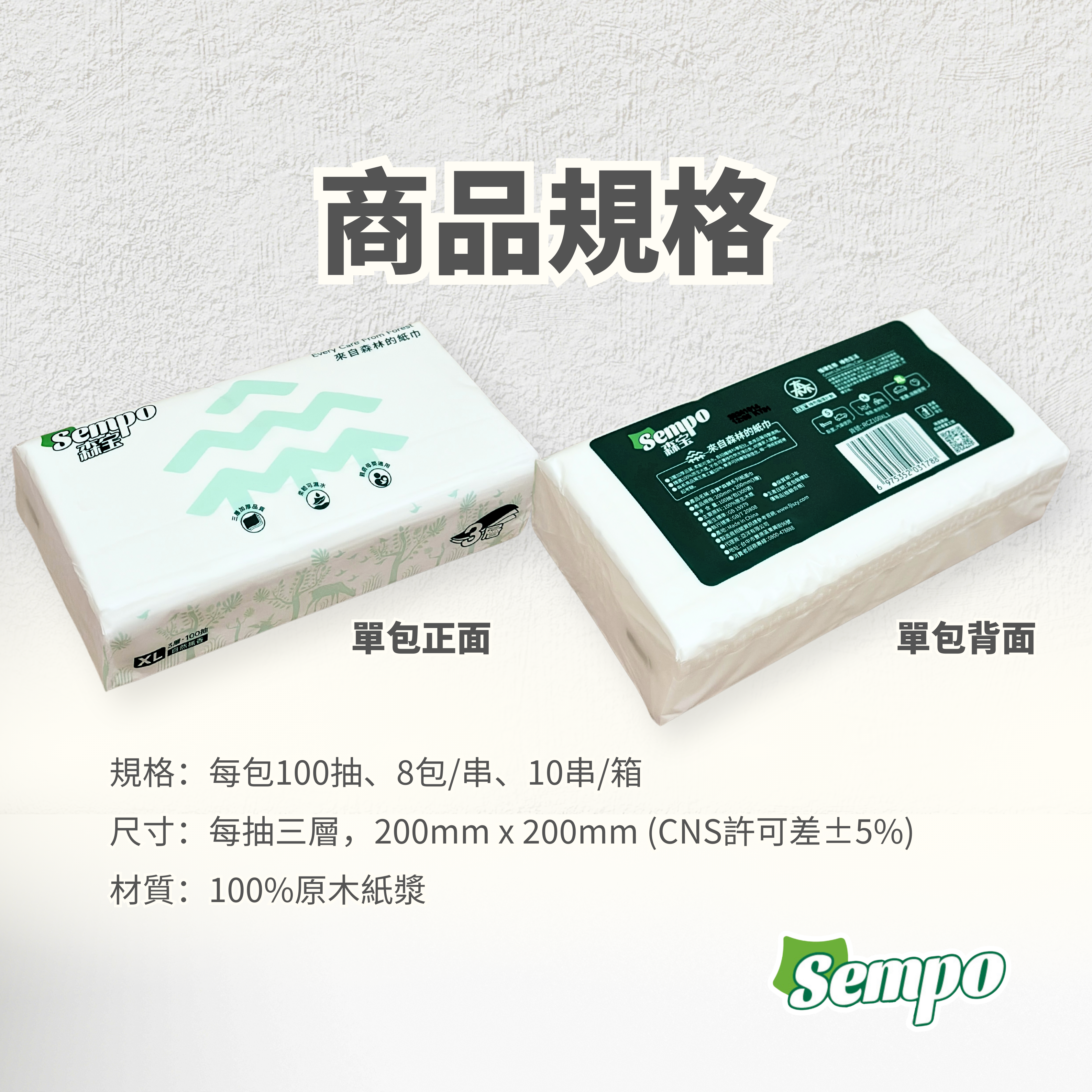 包裝規格:100抽/包 ×8包/串×10串/箱