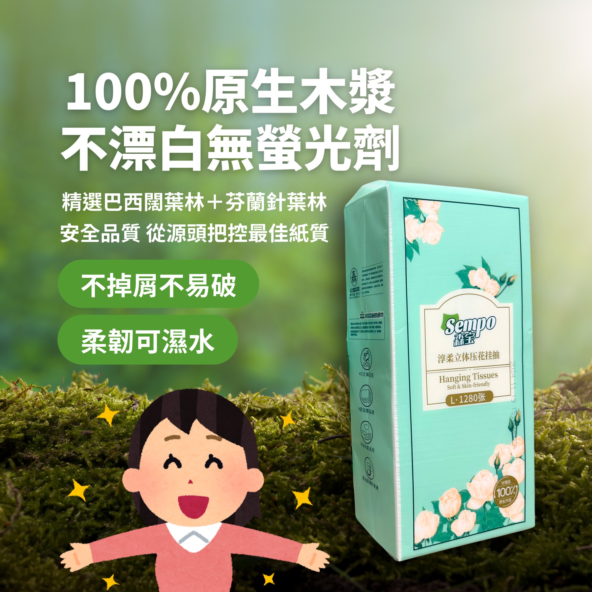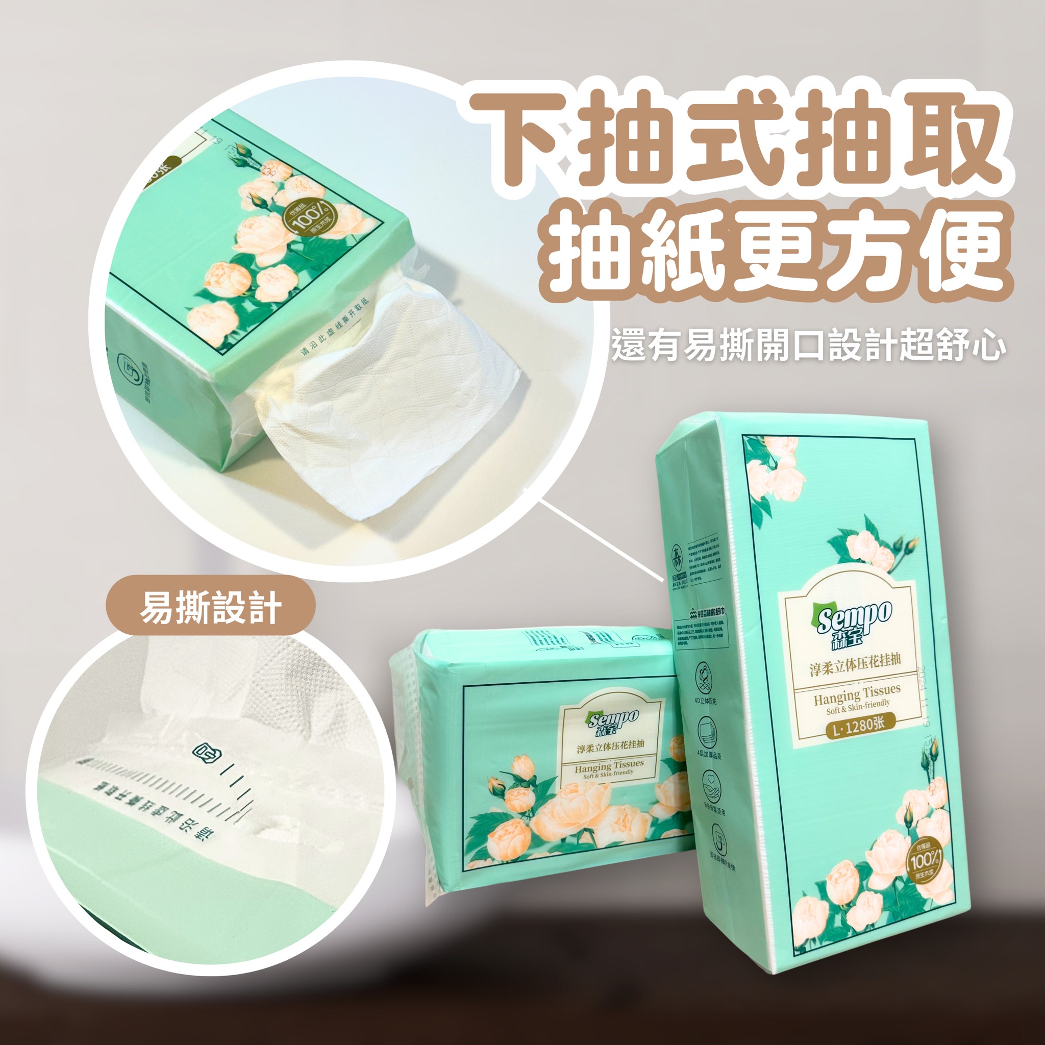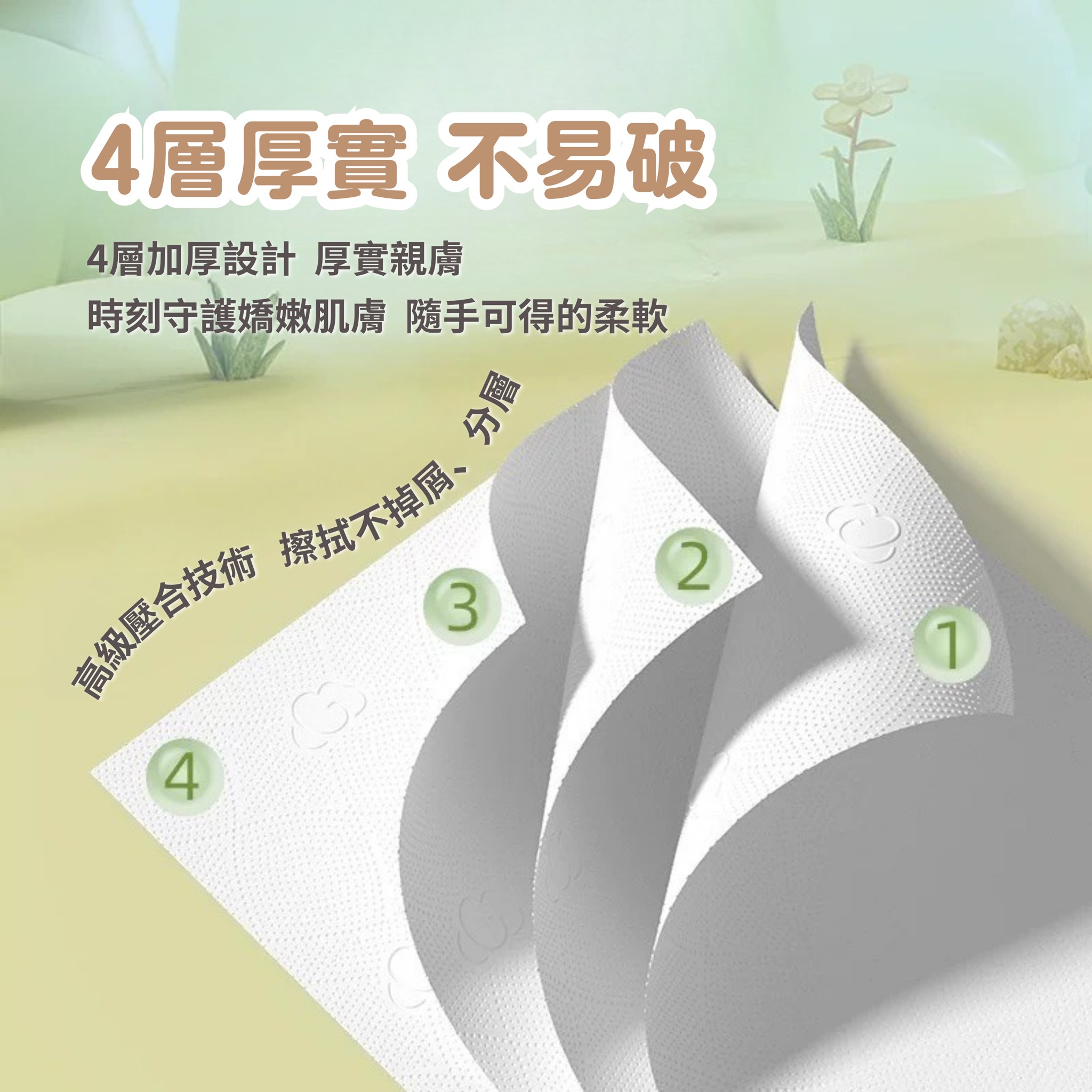 立體壓紋柔軟細膩,四層加厚,紙質堅韌。